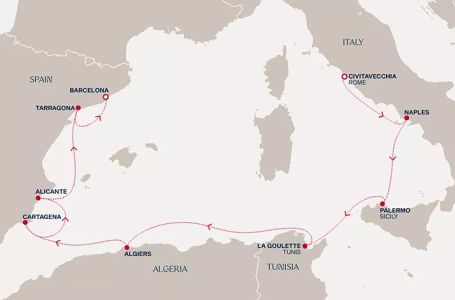 - Маршрут на круиза: Рим (порт Чивитавекия) - Неапол - Палермо (Сицилия) - Ла Гулет (Тунис) - В открито море - Алжир - Картахена - Аликанте - Тарагона - Барселона