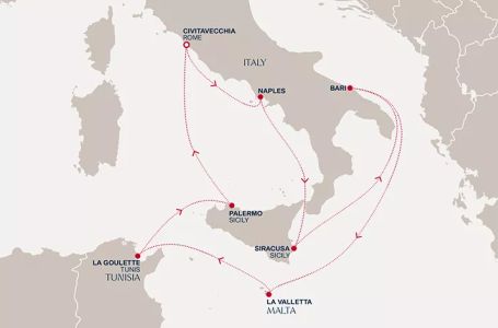 - Маршрут на круиза: Рим (порт Чивитавекия) - Неапол - Сиракуза (Сицилия) - Сиракуза (Сицилия) - Бари - В открито море - Валета - Ла Гулет (Тунис) - Палермо (Сицилия) - В открито море - Рим (порт Чивитавекия)
