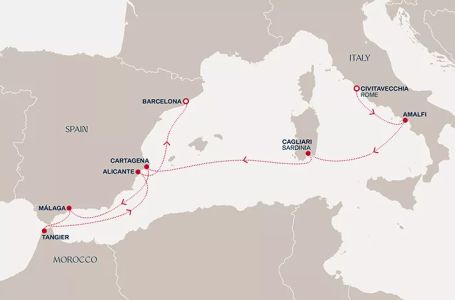 - Маршрут на круиза: Рим (порт Чивитавекия) - Амалфи - Каляри (Сардиния) - В открито море - Картахена - Малага - Малага - Танжер - В открито море - Аликанте - Барселона