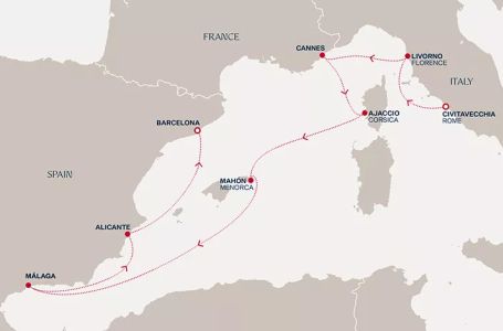 - Маршрут на круиза: Рим (порт Чивитавекия) - Ливорно (Флоренция и Пиза) - Кан - Ажаксьо (Аячо) - Менорка (Маон) - В открито море - Малага - Малага - Аликанте - Барселона