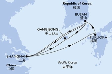 *Към цената е дължима и допълнителна такса обслужване на кораба в размер на 0 € / 0 лв.- Маршрут на круиза: Шанхай - о-в Джеджу - Бусан - В открито море - Шанхай - В открито море - Фукуока - Бусан - В открито море - Шанхай