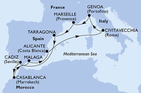*Към цената е дължима и допълнителна такса обслужване на кораба в размер на 0 € / 0 лв.- Маршрут на круиза: Марсилия - Тарагона - В открито море - Кадиз - Казабланка - Малага - Аликанте - В открито море - Рим (порт Чивитавекия) - Генуа - Марсилия