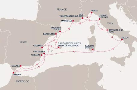 - Маршрут на круиза: Рим (порт Чивитавекия) - Амалфи - Каляри (Сардиния) - В открито море - Картахена - Малага - Малага - Танжер - В открито море - Аликанте - Барселона - Валенсия - Палма де Майорка - Паламос - В открито море - Марсилия - Генуа - Вилфранш (Ница) - Ливорно (Флоренция и Пиза) - Рим (порт Чивитавекия)