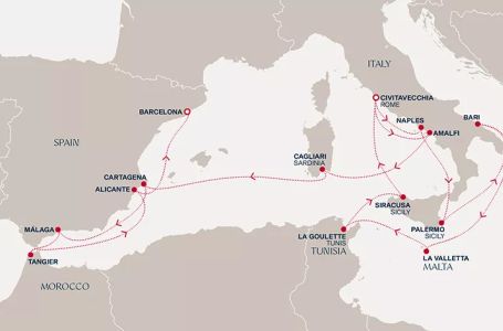 - Маршрут на круиза: Рим (порт Чивитавекия) - Неапол - Сиракуза (Сицилия) - Сиракуза (Сицилия) - Бари - В открито море - Валета - Ла Гулет (Тунис) - Палермо (Сицилия) - В открито море - Рим (порт Чивитавекия) - Амалфи - Каляри (Сардиния) - В открито море - Картахена - Малага - Малага - Танжер - В открито море - Аликанте - Барселона