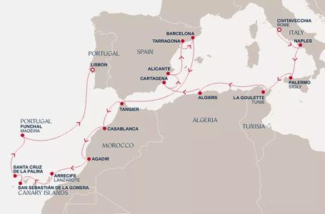 - Маршрут на круиза: Рим (порт Чивитавекия) - Неапол - Палермо (Сицилия) - Ла Гулет (Тунис) - В открито море - Алжир - Картахена - Аликанте - Тарагона - Барселона - В открито море - Танжер - Казабланка - Казабланка - Агадир - Лансароте (Аресифе) - Ла Гомера (Сан Себастиан) - Санта Круз де ла Палма - Мадейра (Фуншал) - Мадейра (Фуншал) - В открито море - Лисабон