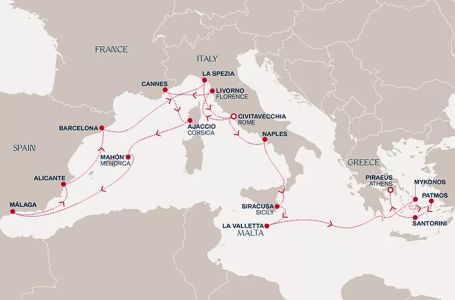 - Маршрут на круиза: Рим (порт Чивитавекия) - Ливорно (Флоренция и Пиза) - Кан - Ажаксьо (Аячо) - Менорка (Маон) - В открито море - Малага - Малага - Аликанте - Барселона - В открито море - Ла Специя - Рим (порт Чивитавекия) - Неапол - Сиракуза (Сицилия) - Валета - В открито море - Миконос - Патмос - Санторини - Атина (Пирея)