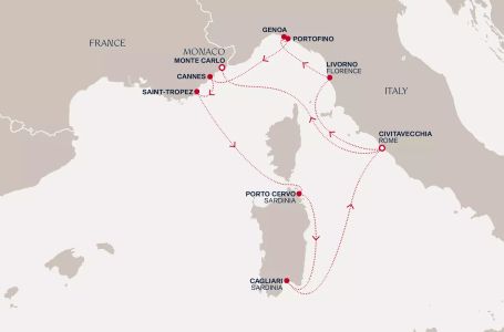 * Цените включват всички такси, премиум all inclusive, високоскоростен интернет на борда и някои трансфери- Маршрут на круиза: Рим (порт Чивитавекия) - Ливорно (Флоренция и Пиза) - Генуа - Портофино - Кан - Сен Тропе - Порто Черво (Сардиния) - Каляри (Сардиния) - В открито море - Рим (порт Чивитавекия) - Монте Карло