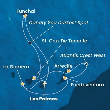 *Към цената е дължима и допълнителна такса обслужване на кораба в размер на 0 € / 0 лв.- Маршрут на круиза: Лас Палмас (Гран Канария) - Санта Круз де ла Палма - Тенерифе (Санта Круз) - Лансароте (Аресифе) - Фуертевентура (Пуерто дел Росарио) - В открито море - Санта Круз де ла Палма - Лас Палмас (Гран Канария)