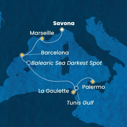 *Към цената е дължима и допълнителна такса обслужване на кораба в размер на 55 € / 107.57 лв.- Маршрут на круиза: Савона - Марсилия - Барселона - В открито море - Ла Гулет (Тунис) - Палермо (Сицилия)