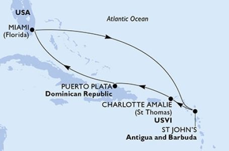 - Маршрут на круиза: Маями (Флорида) - Насау - Оушън Кий - MSC частен резерват - В открито море - Гранд Търк - В открито море - Маями (Флорида)