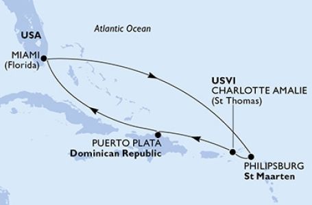 - Маршрут на круиза: Маями (Флорида) - В открито море - Амбър Коув - В открито море - Оушън Кий - MSC частен резерват - Насау - Маями (Флорида)