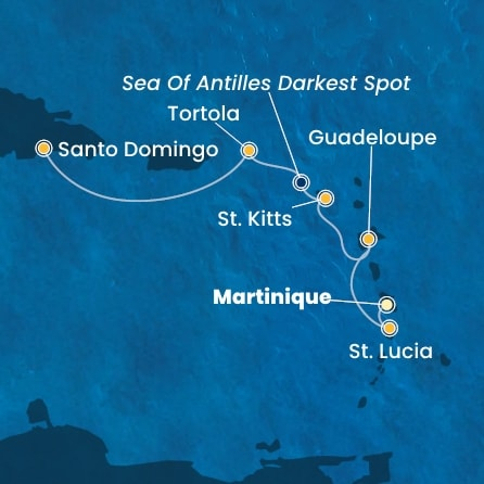 *Към цената е дължима и допълнителна такса обслужване на кораба в размер на 55 € / 107.57 лв.- Маршрут на круиза: Фор дьо Франс - Кастрис - Поант-а-Питр - Бастер - Роудтаун, о-в Тортола - Санто Доминго