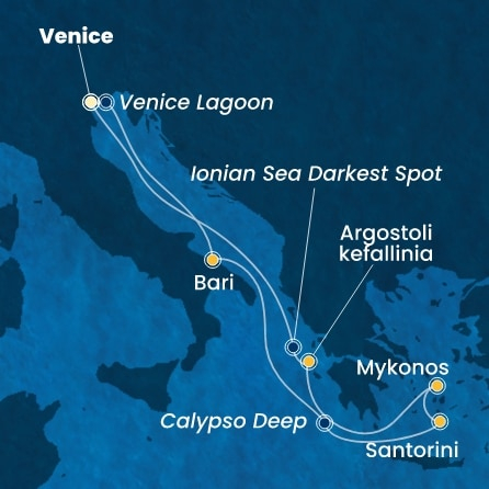*Към цената е дължима и допълнителна такса обслужване на кораба в размер на 77 € / 150.60 лв.- Маршрут на круиза: Венеция (пристанище Маргера) - Лидо (Венеция) - Бари - Падината Калипсо - Падината Калипсо - Santorini (Greece) - Миконос - Аргостоли (Кефалония) - Някъде в Егейско море - Някъде в Егейско море - Венеция (пристанище Маргера)