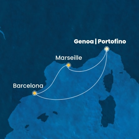 *Към цената е дължима и допълнителна такса обслужване на кораба в размер на 33 € / 64.54 лв.- Маршрут на круиза: Генуа - Марсилия - Барселона - Генуа