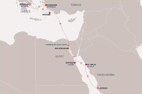 - Маршрут на круиза: Атина (Пирея) - Родос - Лимасол - Александрия - Порт Саид - Суец - Сохна (Кайро) - Сафага - Сафага - Шарм ел Шейх - Акаба (Петра) - В открито море - Джеда - В открито море - В открито море - В открито море - В открито море - Маскат - В открито море - Доха - Абу Даби - Дубай