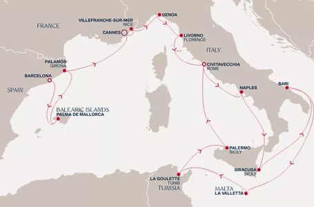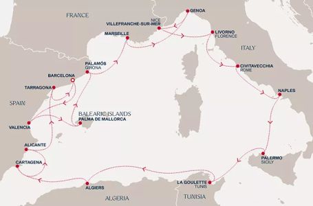 - Маршрут на круиза: Барселона - Валенсия - Палма де Майорка - Паламос - В открито море - Марсилия - Генуа - Вилфранш (Ница) - Ливорно (Флоренция и Пиза) - Рим (порт Чивитавекия) - Неапол - Палермо (Сицилия) - Ла Гулет (Тунис) - В открито море - Алжир - Картахена - Аликанте - Тарагона - Барселона
