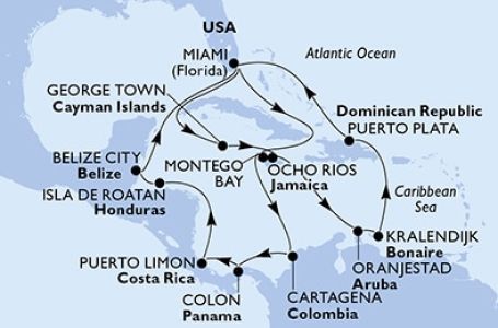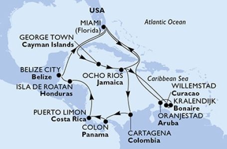 - Маршрут на круиза: Маями (Флорида) - В открито море - Кайманови о-ви (Джордж Таун) - Ямайка (Очо Риос) - В открито море - Кюрасао (Вилемстад) - Бонер (Кралендайк) - Аруба (Оранестад) - В открито море - В открито море - Маями (Флорида) - В открито море - Ямайка (Очо Риос) - В открито море - Картахена (Колумбия) - Колон - Пуерто Лимон - В открито море - Роатан - Белиз - В открито море - Маями (Флорида)