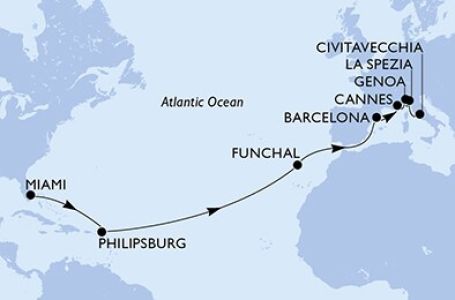 *Към цената е дължима и допълнителна такса обслужване на кораба в размер на 0 € / 0 лв.- Маршрут на круиза: Маями (Флорида) - В открито море - В открито море - Филипсбург, Синт Мартен - В открито море - В открито море - В открито море - В открито море - В открито море - В открито море - Мадейра (Фуншал) - В открито море - В открито море - Барселона - Кан - Генуа - Ла Специя - Рим (порт Чивитавекия)