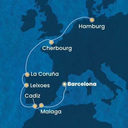 *Към цената е дължима и допълнителна такса обслужване на кораба в размер на 110 € / 215.14 лв.- Маршрут на круиза: Барселона - В открито море - Малага - Кадиз - В открито море - Леишоиш порт (Португалия) - Ла Коруня - В открито море - Шербур - В открито море - Хамбург