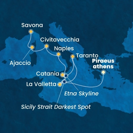 *Към цената е дължима и допълнителна такса обслужване на кораба в размер на 121 € / 236.66 лв.- Маршрут на круиза: Атина (Пирея) - В открито море - Валета - Катания (Сицилия) - Таранто - В открито море - Валета - Катания (Сицилия) - Неапол - Рим (порт Чивитавекия) - Ажаксьо (Аячо) - Савона