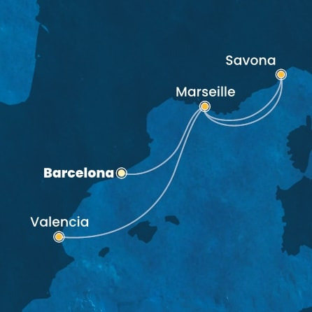 *Към цената е дължима и допълнителна такса обслужване на кораба в размер на 55 € / 107.57 лв.- Маршрут на круиза: Барселона - Марсилия - Савона - Марсилия - В открито море - Валенсия