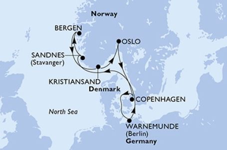 *Към цената е дължима и допълнителна такса обслужване на кораба в размер на 0 € / 0 лв.- Маршрут на круиза: Варнемюнде - В открито море - Санес - Берген - Кристиансанд - Осло - Копенхаген - Варнемюнде
