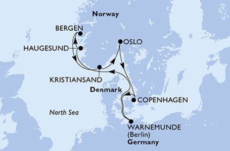 *Към цената е дължима и допълнителна такса обслужване на кораба в размер на 0 € / 0 лв.- Маршрут на круиза: Варнемюнде - В открито море - Хаугесун - Берген - Кристиансанд - Осло - Копенхаген - Варнемюнде