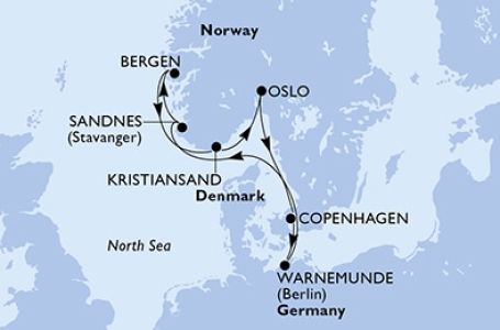*Към цената е дължима и допълнителна такса обслужване на кораба в размер на 0 € / 0 лв.- Маршрут на круиза: Варнемюнде - В открито море - Санес - Берген - Линдал - Осло - Копенхаген - Варнемюнде
