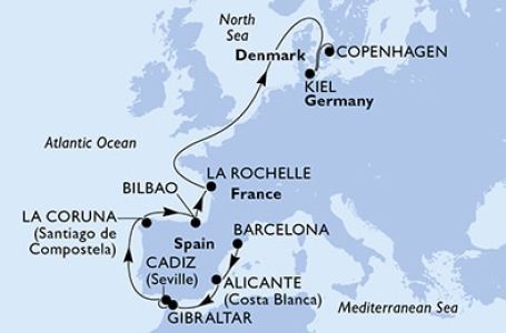 *Към цената е дължима и допълнителна такса обслужване на кораба в размер на 0 € / 0 лв.- Маршрут на круиза: Барселона - Аликанте - Гибралтар - Кадиз - В открито море - Ла Коруня - Билбао - Ла Рошел - В открито море - В открито море - Кил - Копенхаген