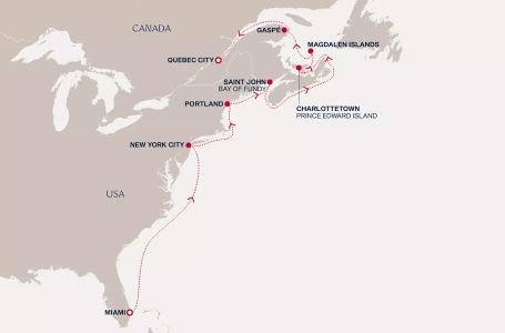 * Цените включват всички такси, премиум all inclusive, високоскоростен интернет на борда и някои трансфери- Маршрут на круиза: Маями (Флорида) - В открито море - В открито море - Ню Йорк - В открито море - Портланд (Мейн) - В открито море - Сидни, Нова Скотия - Шарлъттаун , о-в Принц Едуард - Ил де ла Мадлен - Гаспе - В открито море - Квебек