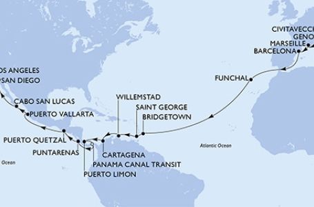 - Маршрут на круиза: Рим (порт Чивитавекия) - Генуа - Марсилия - Барселона - В открито море - В открито море - Мадейра (Фуншал) - В открито море - В открито море - В открито море - В открито море - В открито море - Бриджтаун - Сейнт Джордж - В открито море - Кюрасао (Вилемстад) - В открито море - Картахена (Колумбия) - В открито море - Пуерто Лимон - Панамски канал - Панамски канал - В открито море - Пунтаренас - В открито море - Пуерто Кецал - В открито море - В открито море - Пуерто Ваярта (Мексико) - Кабо сан Лукас (Мексико) - В открито море - Сан Диего - В открито море - Лос Анджелис - Лос Анджелис