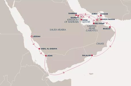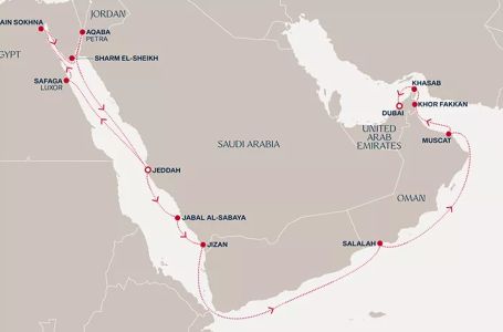 - Маршрут на круиза: Джеда - В открито море - Сафага - Сафага - Сохна (Кайро) - Шарм ел Шейх - Акаба (Петра) - В открито море - Джеда - Джеда - Джабал Алсабая - Джизан - В открито море - В открито море - В открито море - Салалах (Оман) - В открито море - Маскат - Кор ал Факан - Хасаб - Дубай