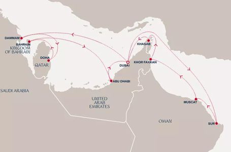- Маршрут на круиза: Дубай - Дубай - В открито море - Дамам - Доха - Абу Даби - Рас-ал-Хайма - Дубай - Дубай - Новогодишна заря - Новогодишна заря - Сур - Маскат - Маскат - Кор ал Факан - Хасаб - Дубай