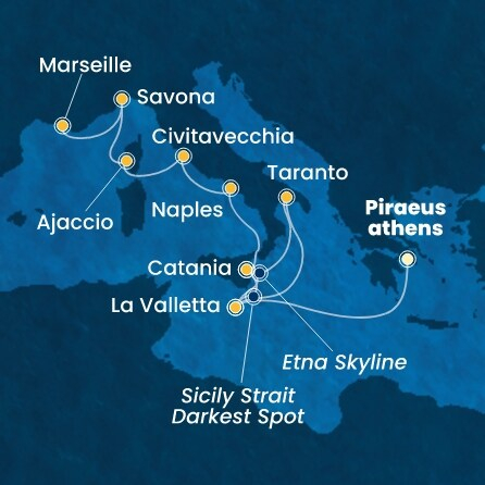 *Към цената е дължима и допълнителна такса обслужване на кораба в размер на 132 € / 258.17 лв.- Маршрут на круиза: Атина (Пирея) - В открито море - Валета - Катания (Сицилия) - Таранто - В открито море - Валета - Катания (Сицилия) - Неапол - Рим (порт Чивитавекия) - Ажаксьо (Аячо) - Савона - Марсилия