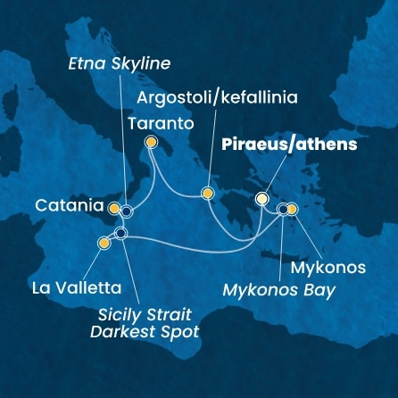 *Към цената е дължима и допълнителна такса обслужване на кораба в размер на 77 € / 150.60 лв.- Маршрут на круиза: Атина (Пирея) - В открито море - Валета - Катания (Сицилия) - Таранто - Аргостоли (Кефалония) - Миконос - Атина (Пирея)