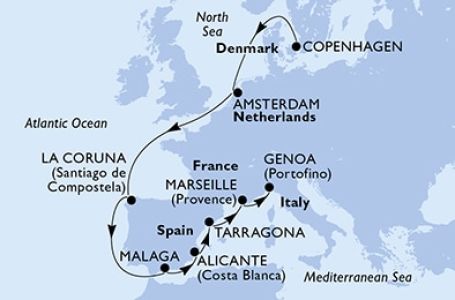 *Към цената е дължима и допълнителна такса обслужване на кораба в размер на 0 € / 0 лв.- Маршрут на круиза: Копенхаген - В открито море - Амстердам - В открито море - В открито море - Ла Коруня - В открито море - Малага - Аликанте - Тарагона - Марсилия - Генуа