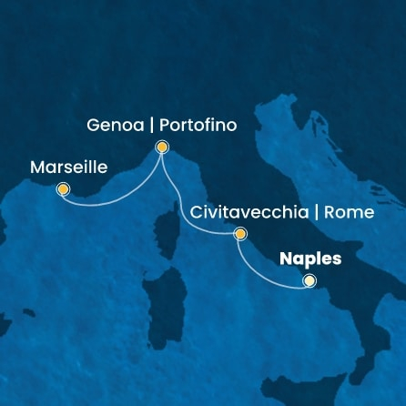 *Към цената е дължима и допълнителна такса обслужване на кораба в размер на 33 € / 64.54 лв.- Маршрут на круиза: Неапол - Рим (порт Чивитавекия) - Генуа - Марсилия