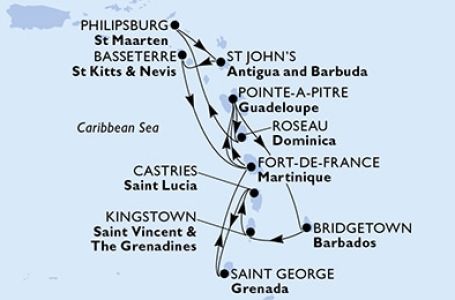 - Маршрут на круиза: Фор дьо Франс - Поант-а-Питр - Сейнт Джоунс - Филипсбург, Синт Мартен - В открито море - Бастер - Розо - Фор дьо Франс - Поант-а-Питр - В открито море - Бриджтаун - Кингстаун - Кастрис - Сейнт Джордж - Фор дьо Франс
