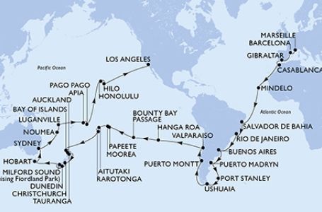 *Към цената е дължима и допълнителна такса обслужване на кораба в размер на 0 € / 0 лв.- Маршрут на круиза: Марсилия - Барселона - В открито море - Гибралтар - Казабланка - В открито море - В открито море - В открито море - Миндело (Кабо Верде) - В открито море - В открито море - В открито море - В открито море - Салвадор де Баия (Бразилия) - В открито море - Рио де Жанейро - Рио де Жанейро - В открито море - В открито море - Буенос Айрес - Буенос Айрес - В открито море - В открито море - Пуерто Мадрин (Аржентина) - В открито море - Порт Стенли - В открито море - В открито море - Ушуая (Аржентина) - Ушуая (Аржентина) - В открито море - В открито море - Пуерто Монт - В открито море - Валпараисо (Чили) - Валпараисо (Чили) - В открито море - В открито море - В открито море - В открито море - Ханга Роа (Чили) - В открито море - В открито море - Питкерн (Баунти бей) - В открито море - В открито море - Таити (Папеете) - Таити (Папеете) - Моореа - В открито море - Аутаки (о-ви Кук) - Раротонга - В открито море - В открито море - В открито море - В открито море - В открито море - Бей ъф Айлъндс - Окланд - Тауранга - В открито море - Крайстчърч - Дънедин - Милфорд Саунд - В открито море - Хобарт - Хобарт - В открито море - Сидни - Сидни - В открито море - В открито море - Нумеа - В открито море - Луганвилл - В открито море - В открито море - В открито море - Апия (Самоа) - Паго Паго (Американска Самоа) - В открито море - В открито море - В открито море - В открито море - В открито море - Хонолулу (о-в Оаху, Хавай) - Хило (Хавай) - В открито море - В открито море - В открито море - В открито море - В открито море - Лос Анджелис