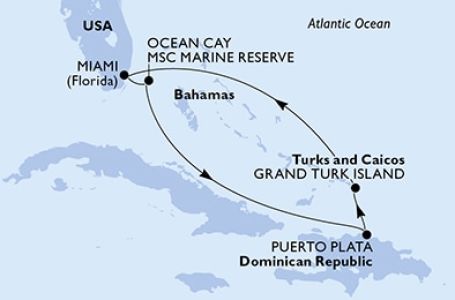 *Към цената е дължима и допълнителна такса обслужване на кораба в размер на 0 € / 0 лв.- Маршрут на круиза: Маями (Флорида) - Оушън Кий - MSC частен резерват - В открито море - В открито море - Амбър Коув - Гранд Търк - В открито море - Маями (Флорида)