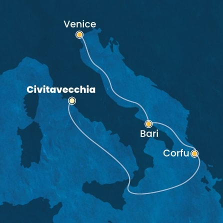 *Към цената е дължима и допълнителна такса обслужване на кораба в размер на 44 € / 86.06 лв.- Маршрут на круиза: Рим (порт Чивитавекия) - В открито море - Корфу - Бари - Венеция (пристанище Маргера)