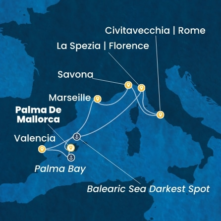 *Към цената е дължима и допълнителна такса обслужване на кораба в размер на 77 € / 150.60 лв.- Маршрут на круиза: Палма де Майорка - Palma bay - Palma bay - Валенсия - Около Балеарите - Около Балеарите - Ла Специя - Рим (порт Чивитавекия) - Савона - Ла Сен сюр Мер (Тулон) - Палма де Майорка