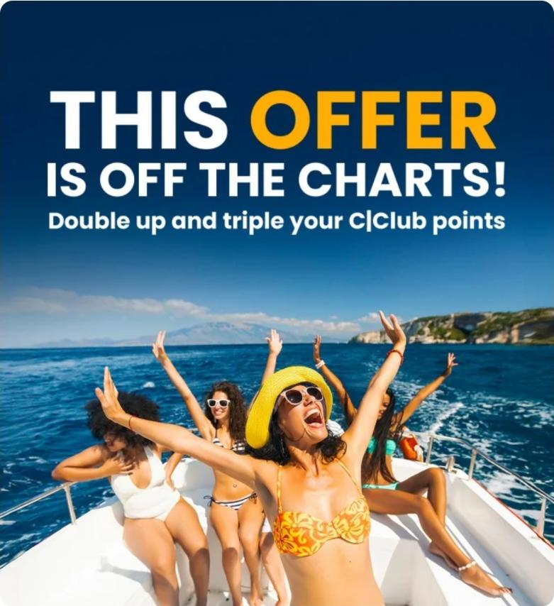 Изберете и резервирайте круиз до 30.11.2026г. като ползвате отстъпката според вашето C|Club ниво. Какво ще получите допълнително: ✅ Удвояване на натрупаните C|Club точки, ако изберете круиз с дата на заминаване минимум след 6 месеца от датата на резервация ✅ Утрояване на натрупаните C|Club точки, ако изберете круиз с дата на заминаване минимум след 12 месеца от датата на резервация *Промоцията е приложима за C|Club нива Bronze, Silver, Gold, Platinum и за тарифи на пътуване (MyCruise, All Inclusive, and Super All Inclusive) |