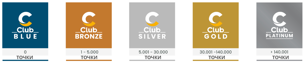 Blue, Bronze, Silver, Gold и престижния Platinum колкото повече пътувайе, толкова повече възможности ще има да се развивате в C|Club, получавайки достъп до повече привилегии и ексклузивни преживявания.